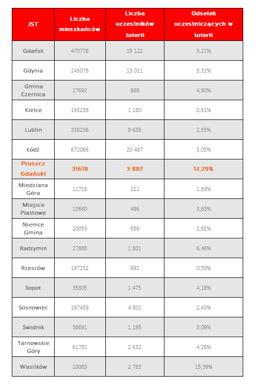 Według raportu “Loterie PIT. Perspektywy dla JST. Raport 2020-2022” działania urzędu w Pruszczu Gdańskim są tak skuteczne, że rokrocznie angażują nawet 15% mieszkańców. W 2020 r. w loterii podatkowej wzięło udział 3.000 osób, w edycjach 2021 i 2022 liczba ta przekroczyła aż 4.000 mieszkańców, a 10% tej liczby stanowili nowi podatnicy. Jest to jeden z najlepszych rezultatów w porównaniu do loterii organizowanych w innych miastach.